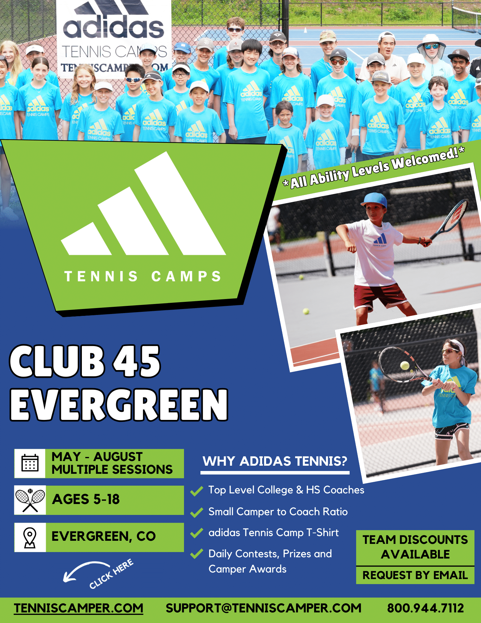 adidas Tennis Camp is open to kids & teens ages 5 to 18 of all ability levels.