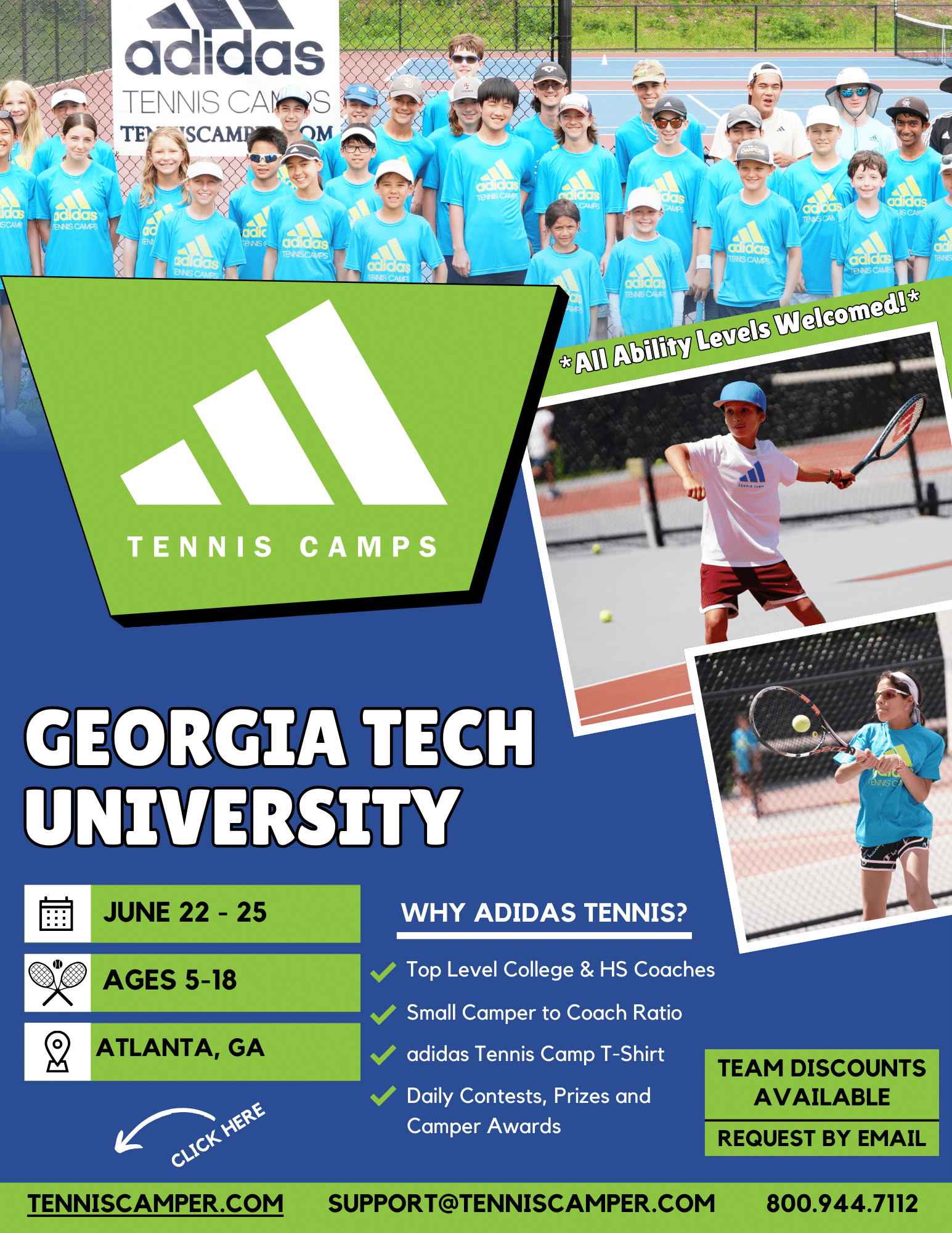 adidas Tennis Camp is open to kids & teens ages 5 to 18 of all ability levels.