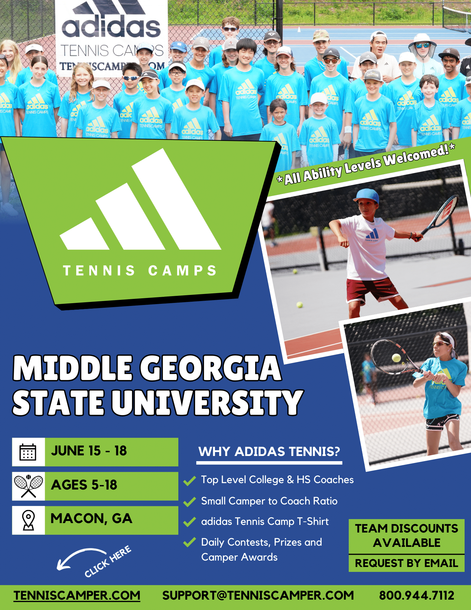 adidas Tennis Camps is proud to announce their brand new camp at Middle Georgia State University. Join us this summer for these GA tennis camps at Middle Georgia State University. Campers will play on the schools beautiful 8 court facility.