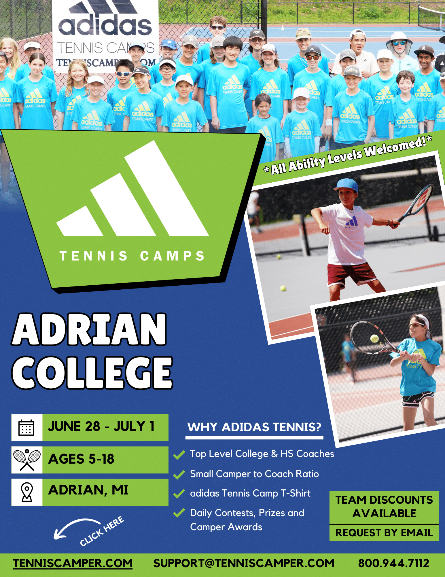 The Adrian College’s Craft Tennis Complex features 12 courts and is home to the Men’s and Women’s Tennis teams. We’re excited to host the adidas Tennis Camps at Adrian College. Join us and have fun while improving your tennis skills this summer!