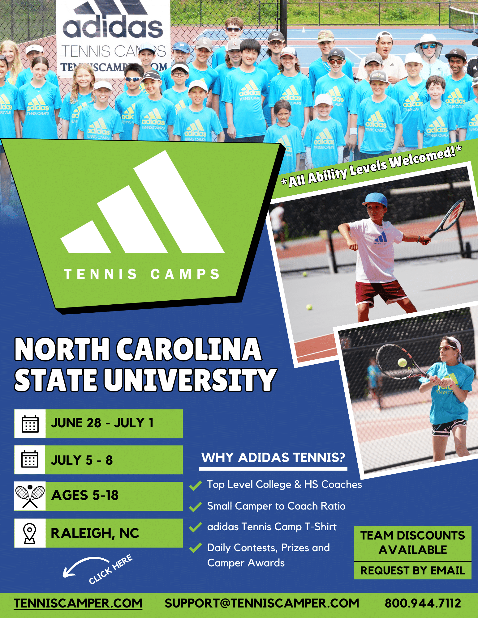 adidas Tennis Camp is open to kids & teens ages 5 to 18 of all ability levels.