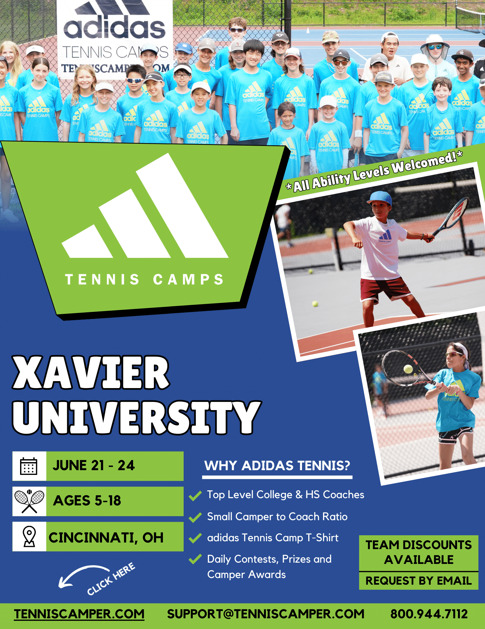 The Jim and Mary Brockhoff Family Tennis Facility at Xavier University features six courts and is home to the Xavier Men’s and Women’s Tennis teams. We’re excited to host the adidas Tennis Camps at Xavier University. Join us and have fun while improving your tennis skills this summer!